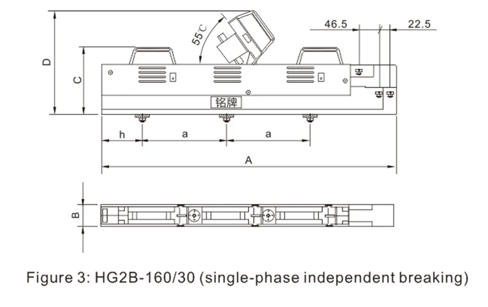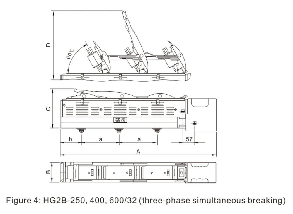 Outline and Installation Dimensions of HG2B-160~630A In-line Fuse Switch Disconnector.